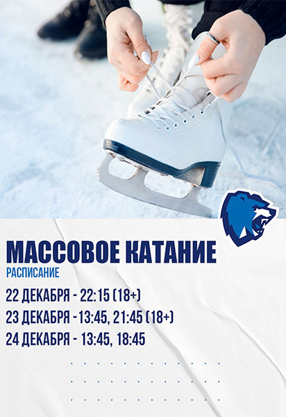 Любителям коньков сообщаем расписание массовых катаний: 22 декабря - 22:15 (18+), 23 декабря - 13:45, 21:45 (18+), 24 декабря - 13:45, 18:45. А если вам исполнилось 65, то катание для вас бесплатное. Только не забудьте подтвердить свой возраст с помощью пенсионого или паспорта.