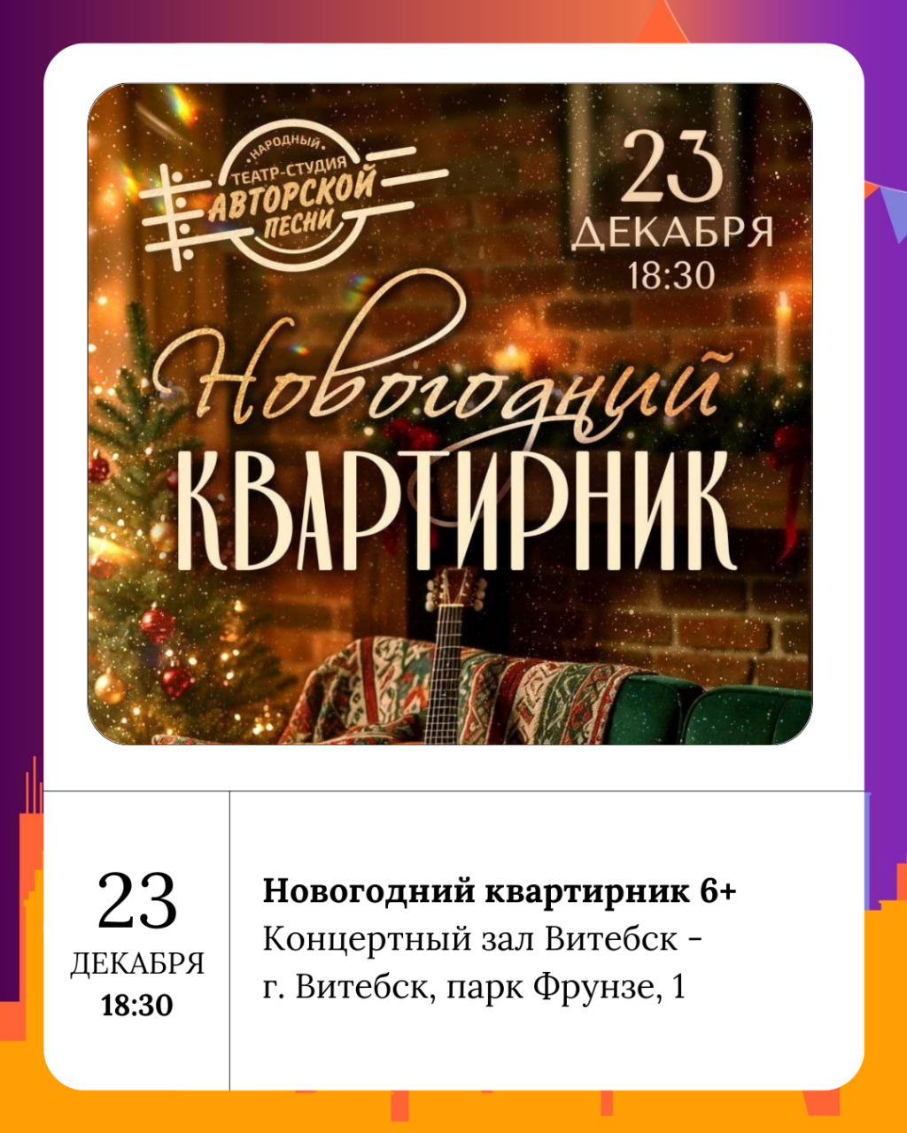 Новогодний квартирник 6+ пройдет в концертном зале Витебск во вторник.