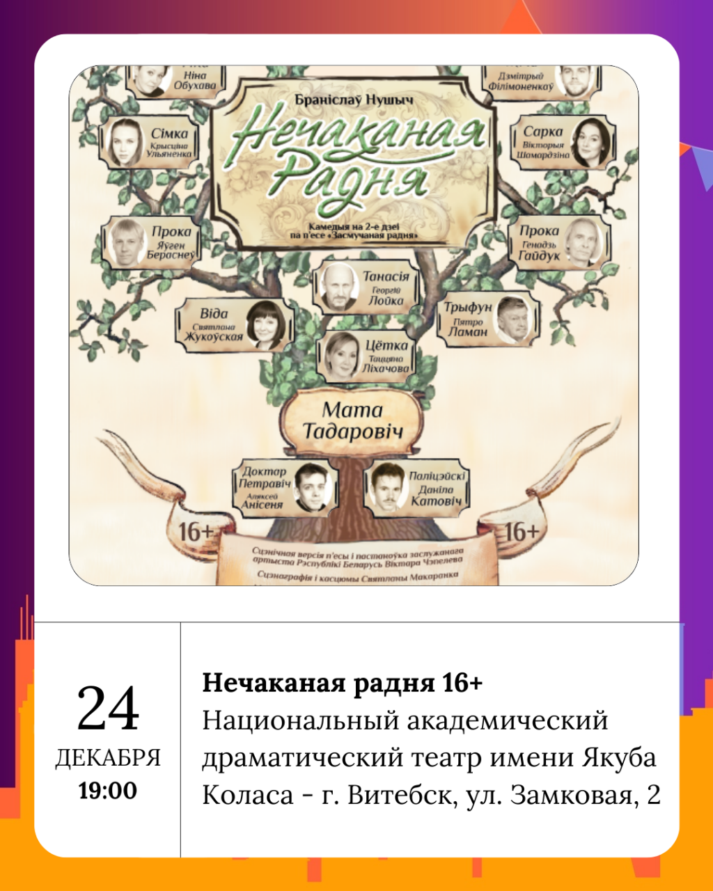 Национальный академический драматический театр имени Якуба Коласа приглашает на спектакль Нечаканая радня 16+ 24 декабря.