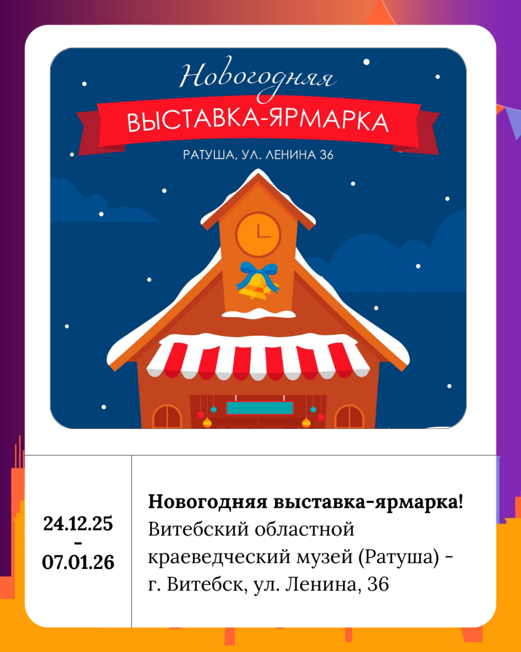 Понедельник в Витебске начинается не с хмурых будней, а с предновогоднего настроения: город уже сияет огнями, витрины зовут на праздники, а афиша обещает три дня культурного марафона. Рабочая неделя короткая — всего три дня, так что можно смело позволить себе маленькие радости и вечерние выходы, ведь Новый год уже совсем близко!