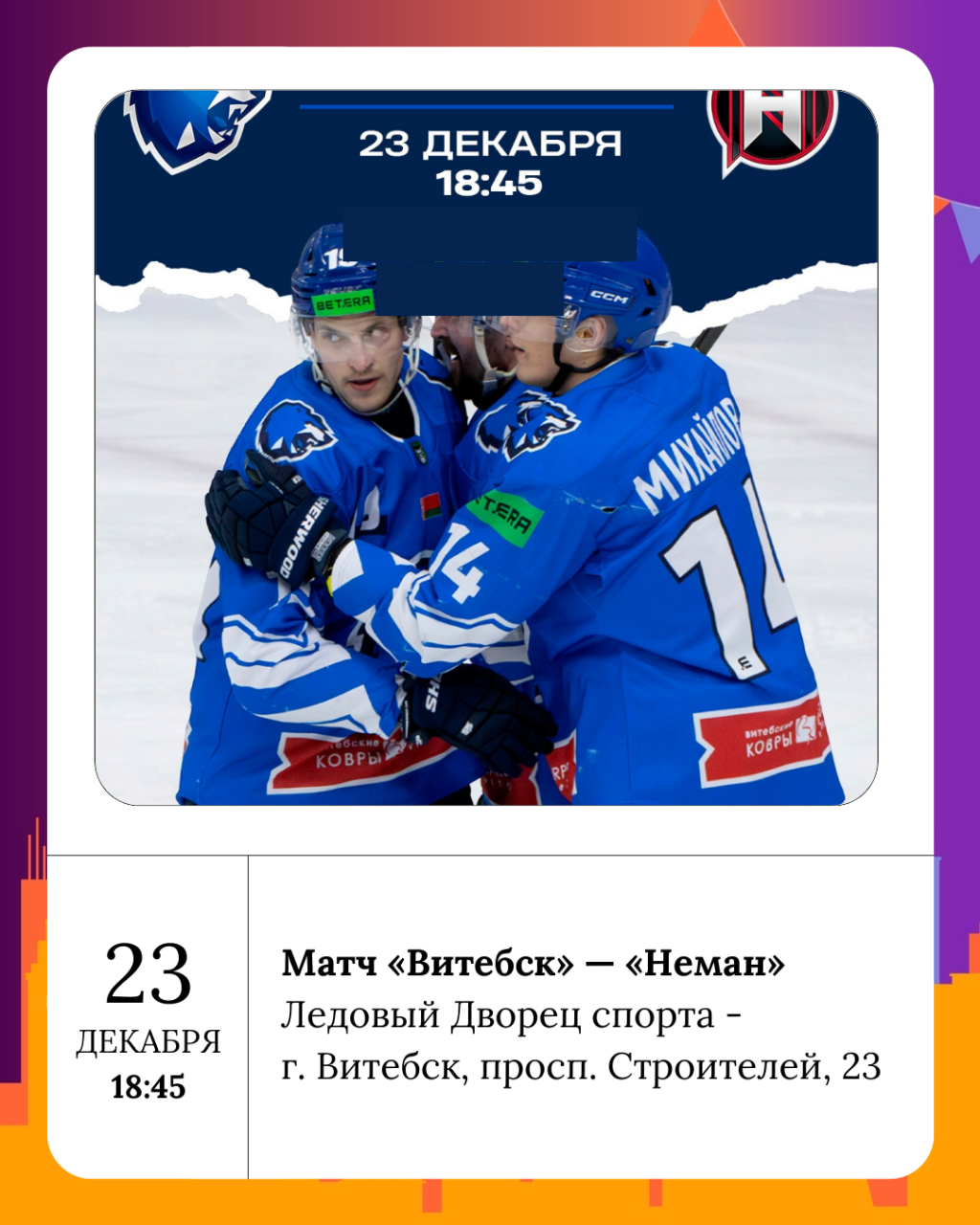 ХК «Витебск» обыграл «Неман» в домашней встрече в воскресенье, а уже завтра команды снова выйдут на лёд. Не пропустите реванш!