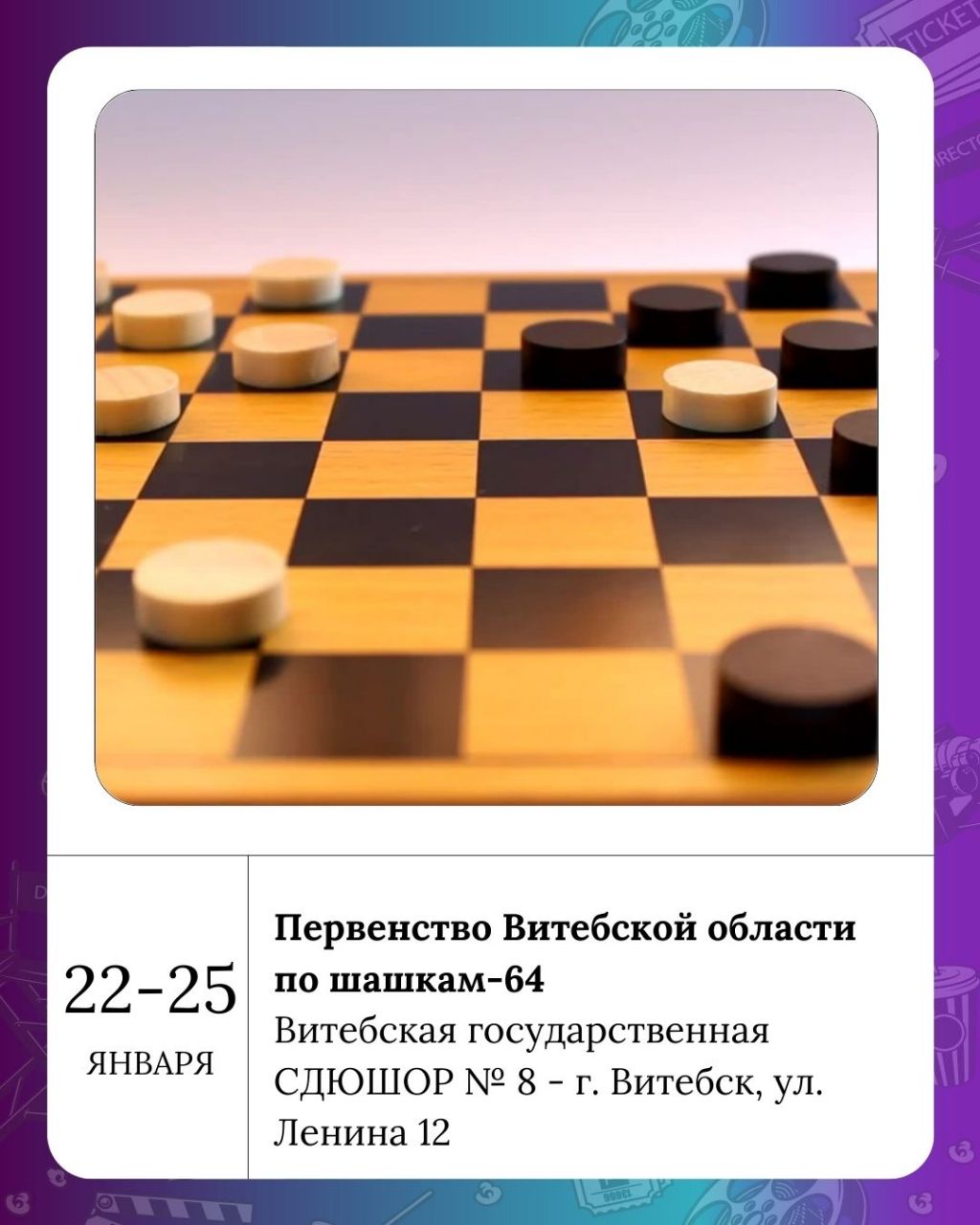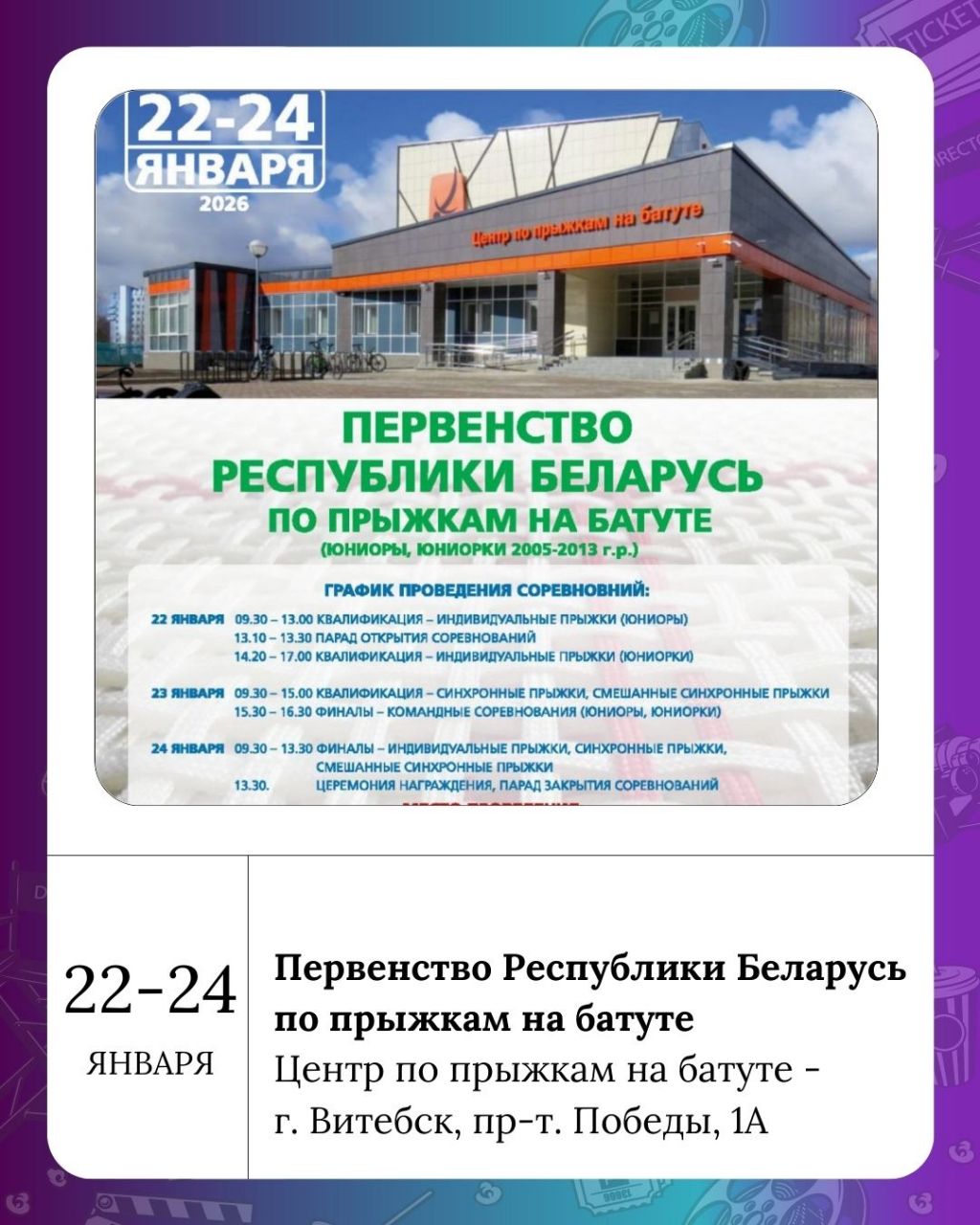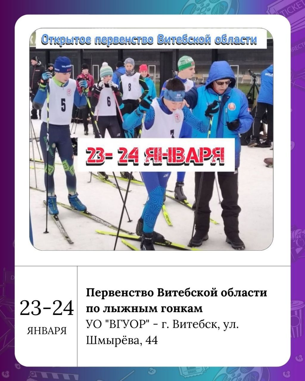 Первенство Республики Беларусь проходит в центре по прыжкам на батуте. Первенство Витебской области по шашкам-64 - в УСУ «Витебская государственная СДЮШОР № 8», Первенство Витебской области по лыжным гонкам - в УО "ВГУОР". Болеем за наших!