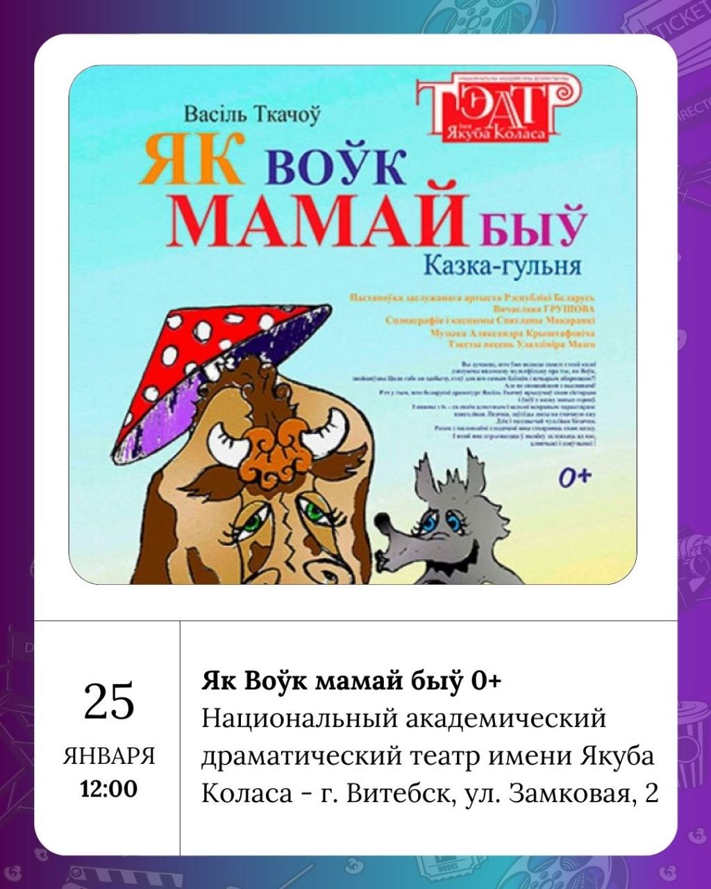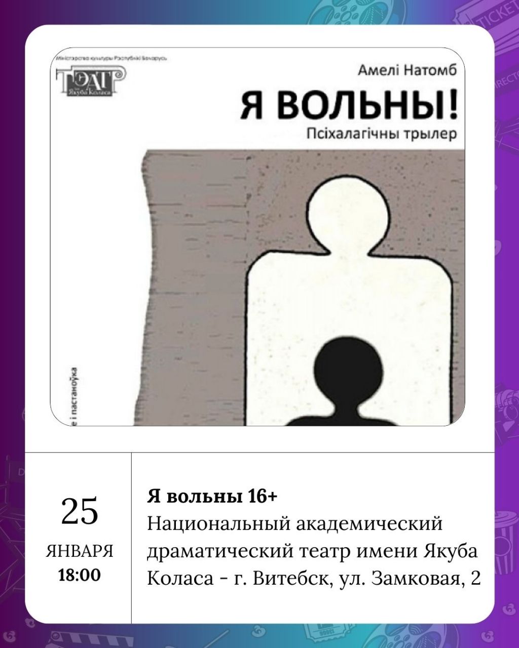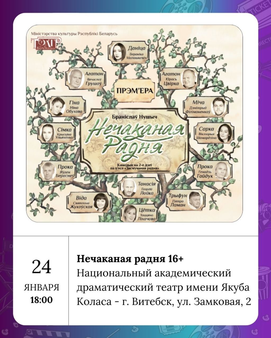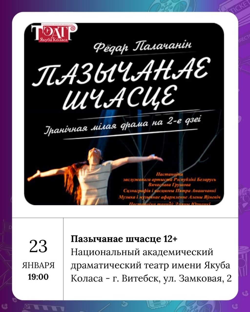 Национальный академический драматический театр имени Якуба Коласа сегодня приглашает на спектакль Пазычанае шчасце 12+, завтра - на Нечаканая радня 16+, а в воскресенье - на Я вольны 16+. Деток артисты театра ждут на постановку Лясное сяброўства 0+ в субботу, и на Як Воўк мамай быў 0+ в воскресенье.