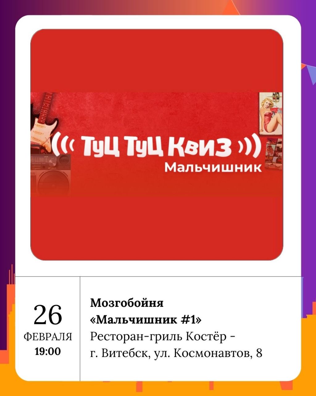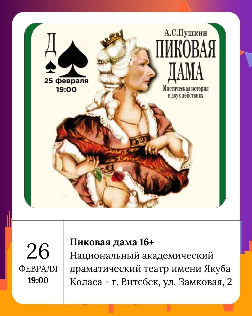 Четверг также богат на культурные события. Для любителей музыки Витебская областная филармония приглашает на музыкальные истории «Наталья Гайда» (6+). Национальный академический драматический театр имени Якуба Коласа представит зрителям спектакль «Пиковая дама» (16+) в исполнении Смоленского камерного театра. А завершить этот день можно будет на весёлой ноте, приняв участие в музыкальной Мозгобойне Туц Туц Квиз «Мальчишник#1». Эта игра, наполненная типичными мужскими треками, открыта для всех желающих, включая девушек.