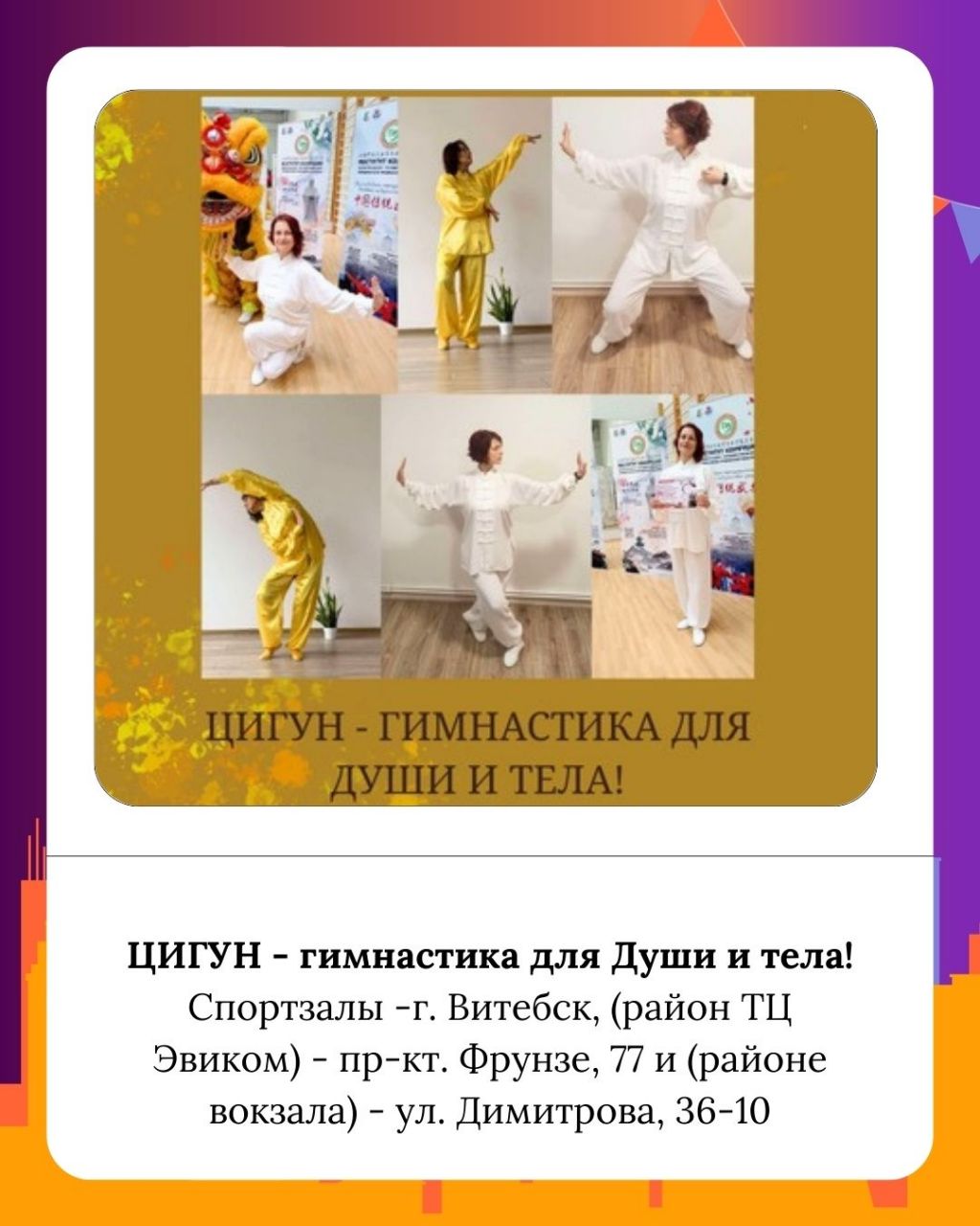Укрепить здоровье и обрести гармонию с собой вы сможете благодаря занятиям «Цигун», которые обещают стать настоящей гимнастикой для души и тела. С помощью медитативно-дыхательных практик, концентрации внимания и плавных движений освободите тело от напряжения.