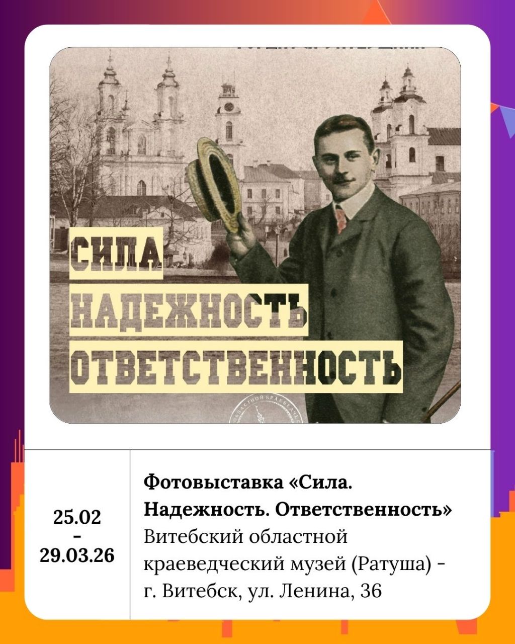 Фотовыставка «Сила. Надежность. Ответственность» представляет Витебский областной краеведческий музей (Ратуша). Каждая из фотографий, представленных на выставке – это портрет на фоне времени.