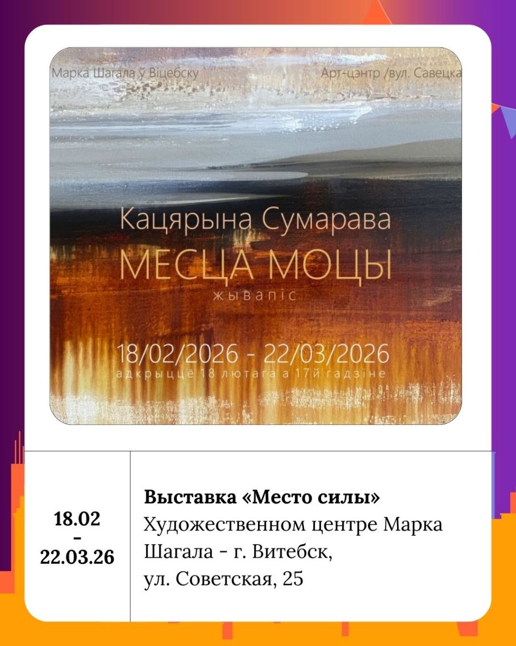 В Художественном центре Марка Шагала проходит выставка картин Екатерины Сумаровой «Место силы». Выразительные, красочные работы одновременно напоминают пейзажи, состояние природы и внутреннее состояние человека, его эмоции, переживания, размышления и медитацию, в которых свет и потоки цвета помогают углубиться. А для тех, кто предпочитает активный отдых и интеллектуальные вызовы, организована тематическая Мозгобойня «Очень странная игра», для любителей пощекотать нервы.