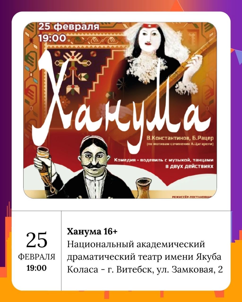 Вечером в Витебске пройдет Квиз Сити Шоу «О чём говорят мужчины», где участники смогут проверить свою эрудицию и посмеяться над остроумными вопросами. А ценители театрального искусства смогут насладиться в Национальном академическом драматическом театре имени Якуба Коласа постановкой «Ханума» (16+) в исполнении Смоленского камерного театра.