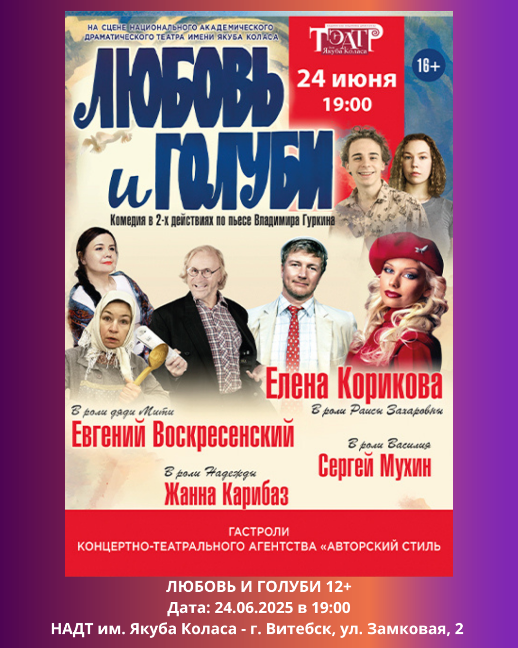 Лирическая комедия «Любовь и голуби» − знакомая всем нам невероятно веселая и одновременно трогательная история любви, измены и прощения по пьесе Владимира Гуркина будет показана в национальном академическом драматическом театре имени Якуба Коласа во вторник. А в четверг - Фанцікі 16+.