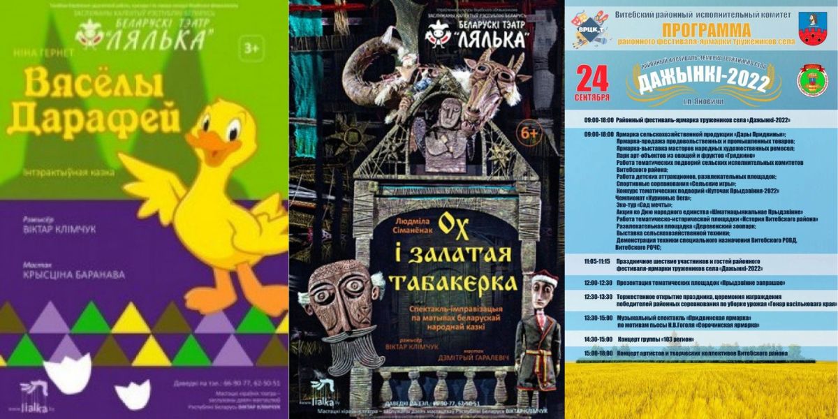 Самым ярким событием предстоящих выходных можно считать «Дажынки». В городском поселке Яновичи Витебского района в субботу пройдет районный фестиваль-ярмарка тружеников села «Дажынкі-2022». С 9.00 до 18.00 в уютном населенном пункте состоятся различные мероприятия на любой вкус. Яновичи расположены примерно в сорока километрах от областного центра. На общественном транспорте проблем доехать и вернуться назад не будет, поэтому витебчане и гости могут интересно провести выходной день в глубинке. Подробнее о программе фестиваля тут>>