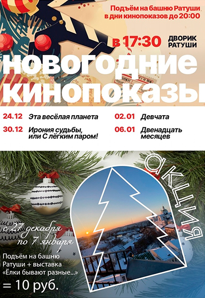Новогодние кинопоказы подготовил для нас Витебский областной краеведческий музей (Ратуша) уже завтра, в 17.30. Это мероприятие можно совместить с подъемом на башню Ратуши и посещением выставки «Ёлки бывают разные…». И все вместе нам обойдется в 10 рублей!