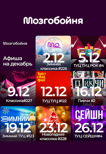 По традиции давайте начнем неделю в Мозгобойне! Сегодня там - Новогодняя Мозгобойня - последняя игра 2024 года. А в четверг - итоговая игра музыкального сезона - ТУЦ СЕЙШН Карнавал!