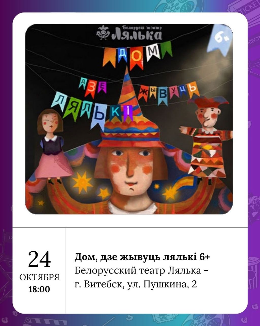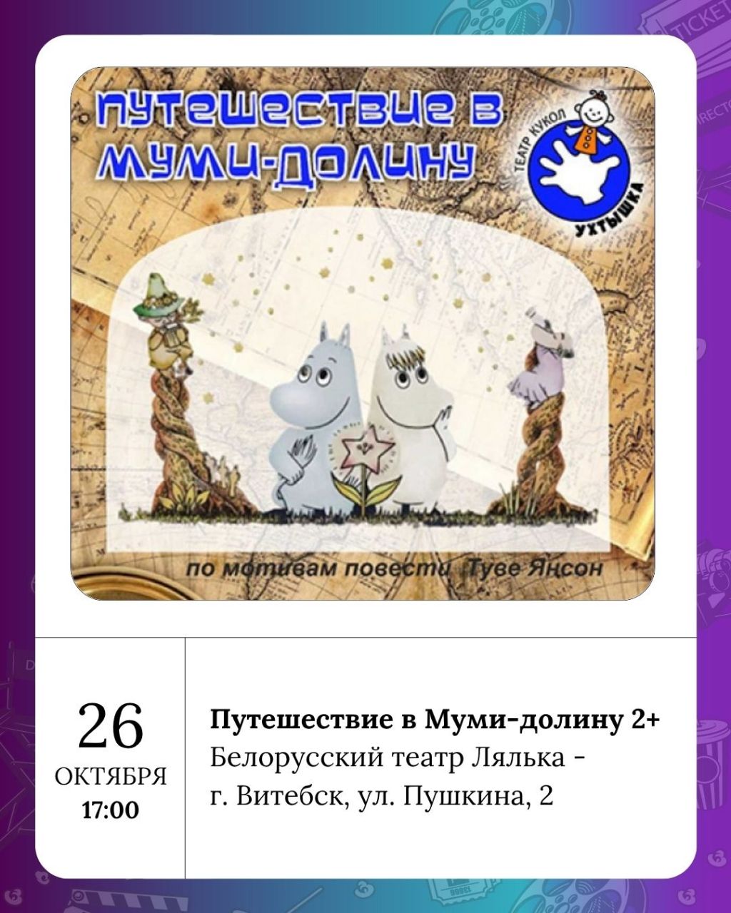 "Лялька" 24 октября приглашает в познавательно-зрелищное путешествие по театру Дом, дзе жывуць лялькі 6+! Вы узнаете историю театра, его секреты, легенды, а также познакомитесь с некоторыми сказочными персонажами. А с кем-то из них, возможно, даже подружитесь. 25 октября на сцене театра - Девочка и медведь 3+, 26 октября - Церам-церамок 3+ и Путешествие в Муми-долину 2+.