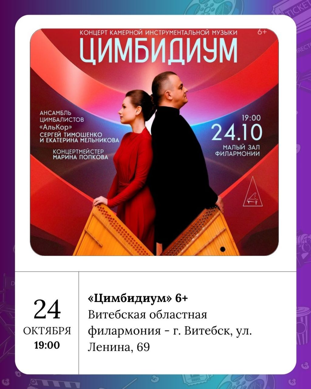 Витебская областная филармония сегодня приглашает на концерт камерной инструментальной музыки «Цимбидиум» 6+, посвященный одному из самых самобытных музыкальных инструментов – цимбалам.