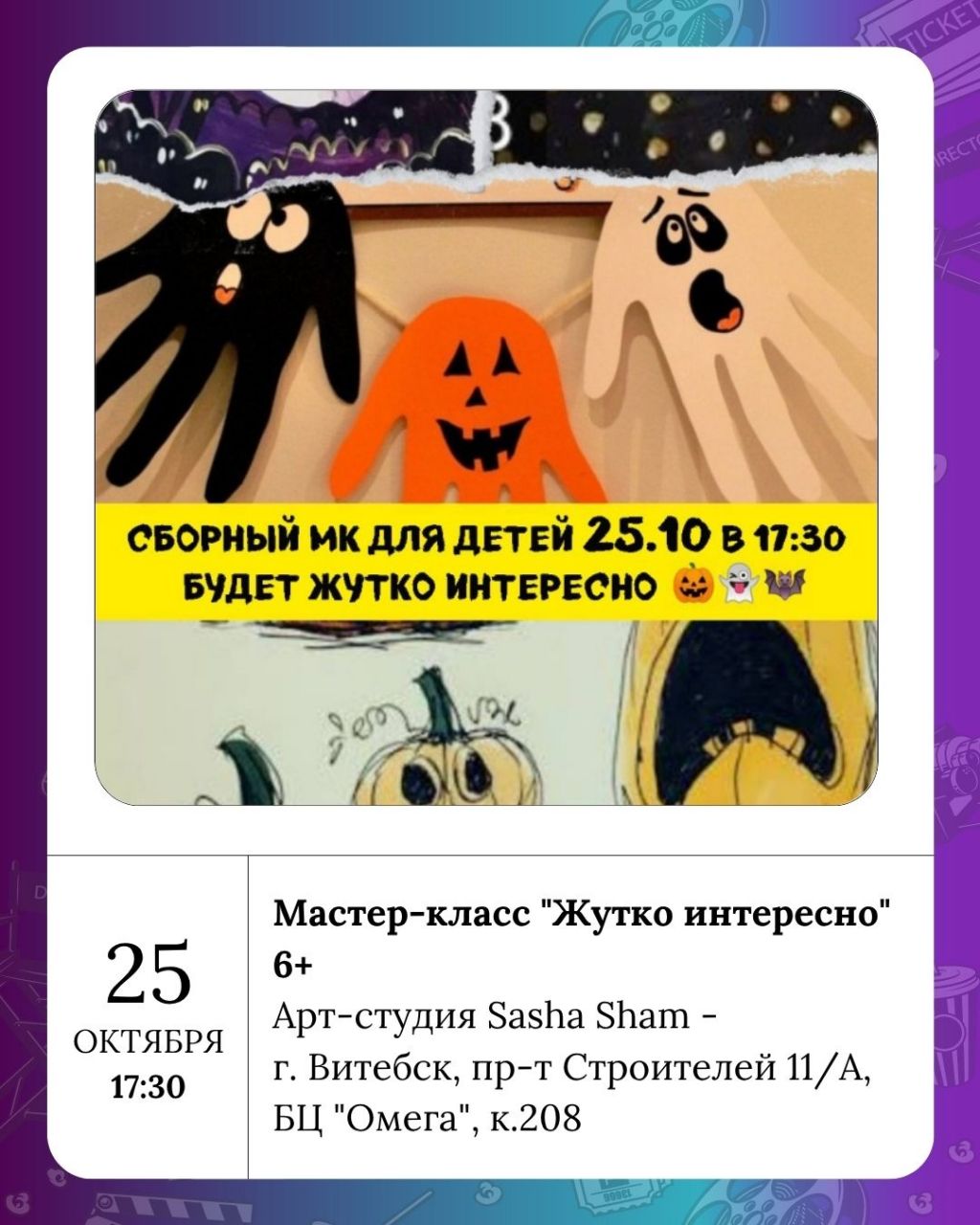 В преддверии мистического праздника Halloween Арт-студия Sasha Sham приглашает на Мастер-класс "Жутко интересно" 6+ в субботу. Вас ждёт создание собственной страшно красивой картины — будет по-настоящему волшебно!
