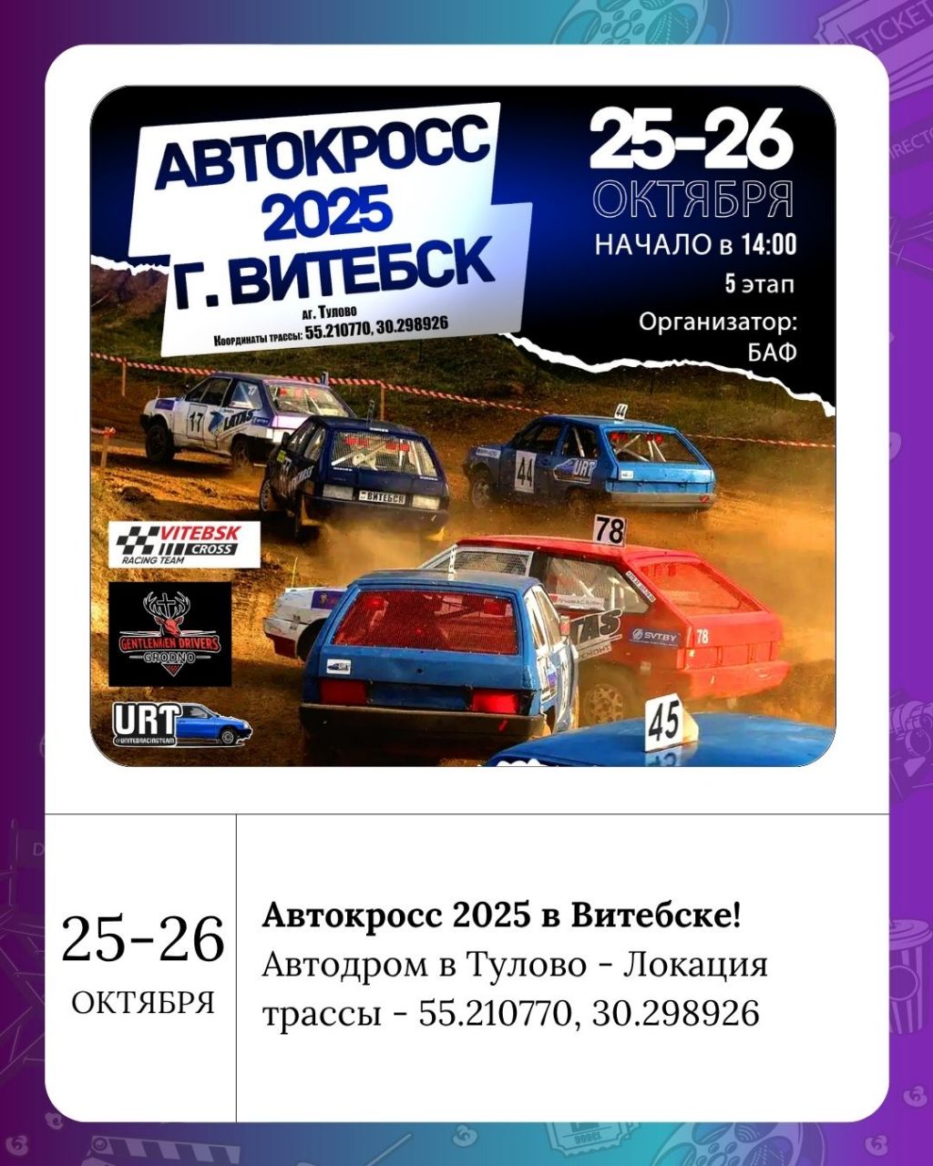 5-й этап Чемпионата Республики Беларусь по автокроссу пройдет 25-26 октября в Витебске, на Автодроме в Тулово. Приготовьтесь к зрелищным гонкам и поддержите своих фаворитов! Локация трассы - 55.210770, 30.298926.