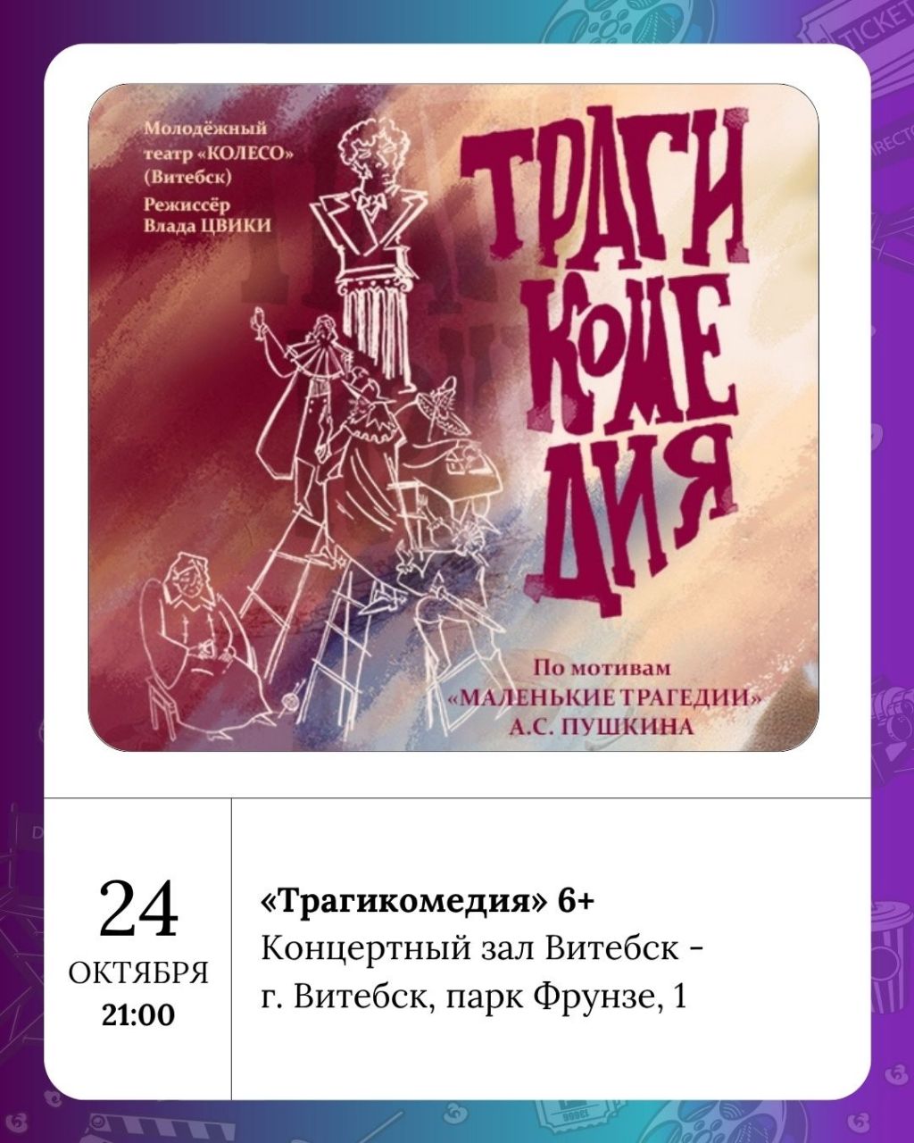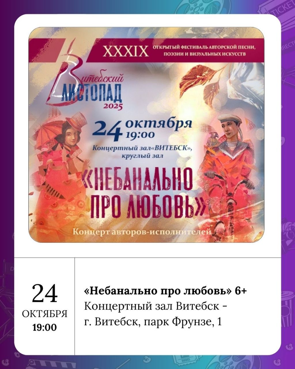 В КЗ "Витебск" сегодня в рамках XXXIX открытого фестиваля авторской песни, поэзии и визуальных искусств «Витебский листопад» пройдет концерт «Небанально про любовь» 6+ в 19.00, а в 21.00 покажут «Трагикомедию» 6+ по мотивам «Маленькие трагедии» А.С. Пушкина. Все события фестиваля смотрите в афише.
