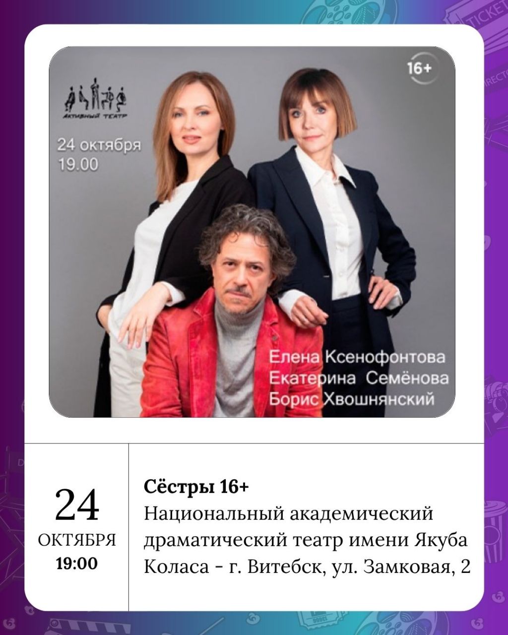 Национальный академический драматический театр имени Якуба Коласа сегодня представляет спектакль Сёстры 16+ в исполнении российских актеров Елены Ксенофонтовой, Екатерины Семеновой и Бориса Хвошнянского. В субботу витебские артисты покажут Мая жонка-падманшчыца 12+, а в воскресенье - Самая жаданая 12+. Для деток здесь в воскресенье - Вядзьмарка і Дыназаўрык 0+.
