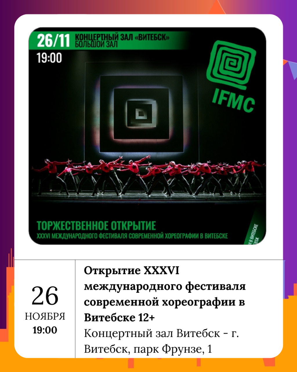 Конечно же, самым грандиозным, не побоюсь этого слова, событием недели станет XXXVI международный фестиваль современной хореографии в Витебске. Его открытие состоится уже в среду, и затем целых 4 дня будет проходить масса различных мероприятий в его рамках: от премьерных постановок до творческих встреч. Не пропустите!