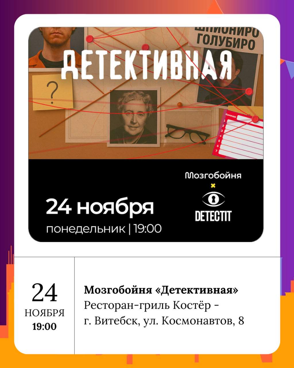 24 ноября в 19:00 - Мозгобойня Кино и музыка, советское / или Мозгобойня Детективная — тематическая игра про тайны следствий, чудеса криминалистики, необычные находки и злодеяния. 27 ноября в 19:00 здесь же - Туц Туц квиз Вечные хиты #3 — музыкальная игра с хитярами всех жанров и эпох / или Туц Туц квиз Популярная музыка#3 — популярные зарубежные и отечественные треки 50/50.
