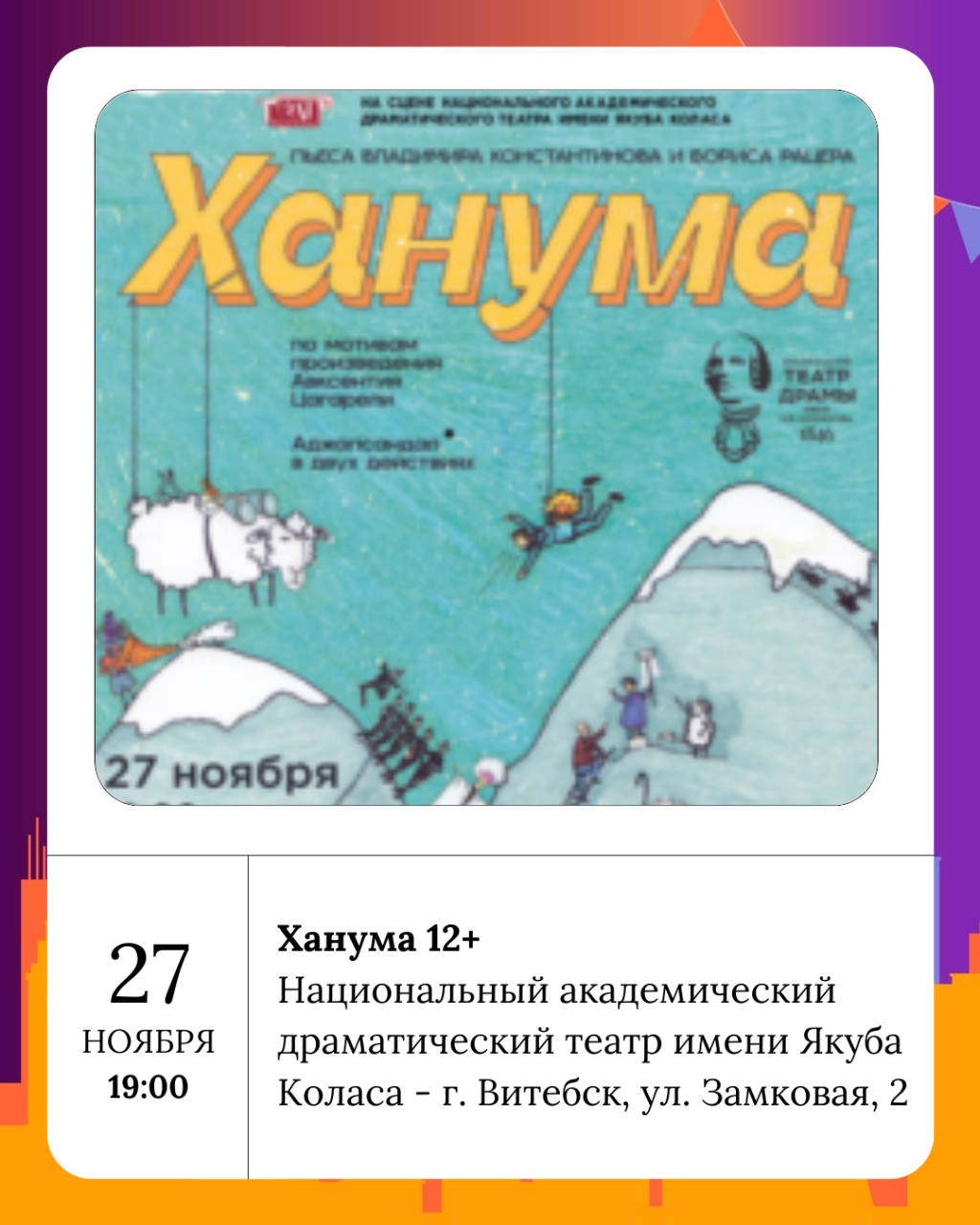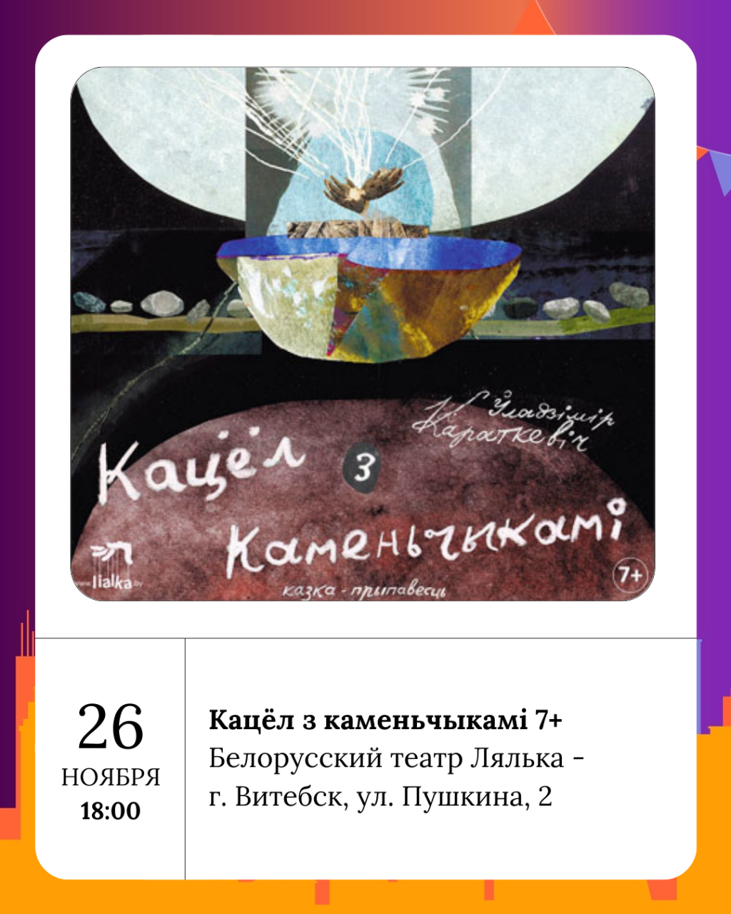 Белорусский театр Лялька в среду приглашает на спектакль Кацёл з каменьчыкамі 7+. В национальном академическом драматическом театре имени Якуба Коласа в этот день - Ревизор 12+ в постановке архангельского театра драмы им. М.В. Ломоносова, а в четверг в том же исполнении - Ханума 12+.