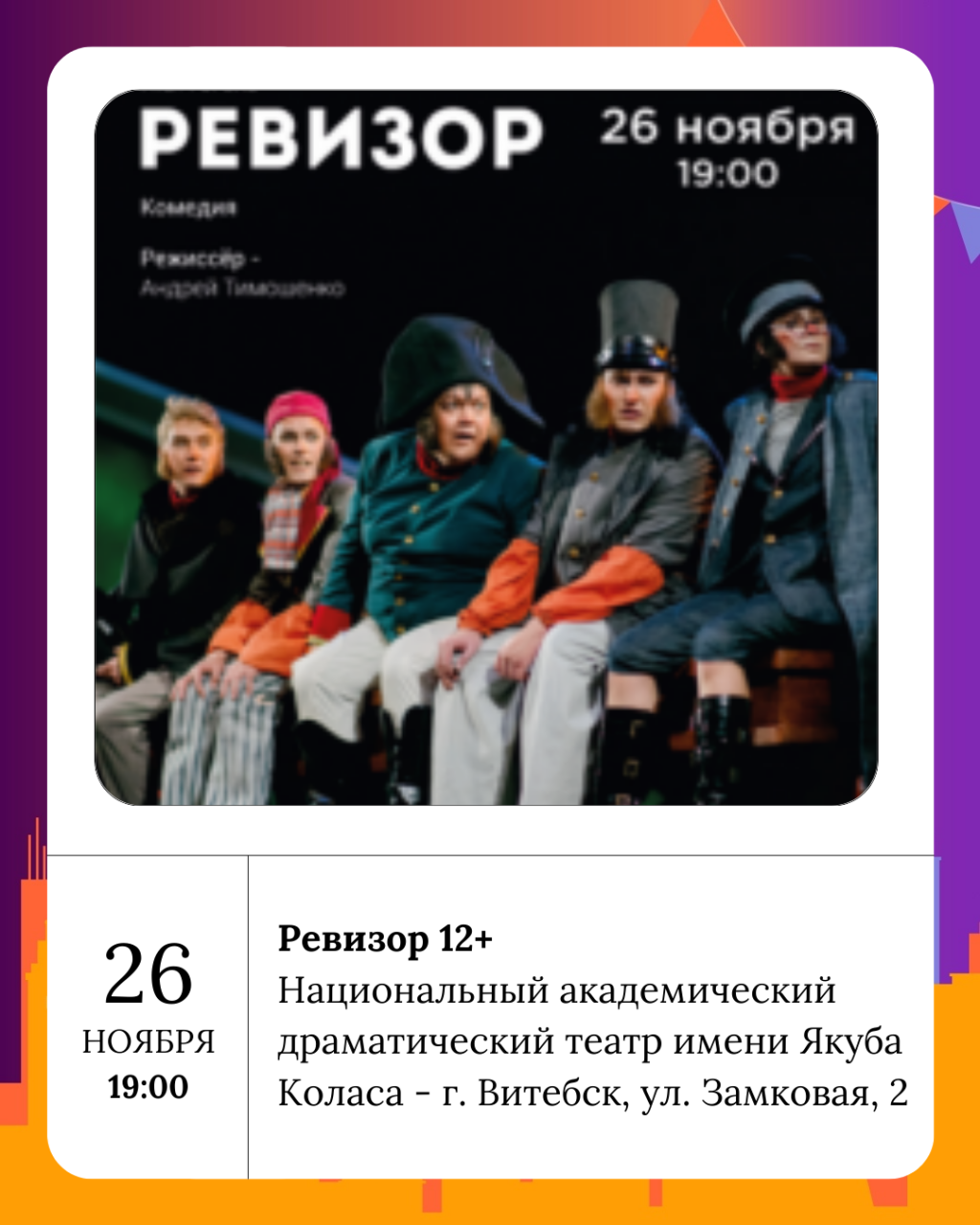 Пусть этот понедельник будет лёгким, а рабочая неделя — продуктивной и вдохновляющей. Афиша Витебска уже позаботилась о том, чтобы каждый день приносил новые эмоции и идеи. Улыбайтесь, планируйте культурные вечера и начинайте неделю с хорошего настроения — тогда пятница точно подмигнёт вам быстрее!