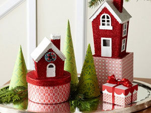 Поставьте несколько блестящих домиков на маленькие коробочки, обернутые упаковочной бумагой. Для создания «елочек» сверните в конус квадратный листок бумаги для скрапбукинга, склейте края и подровняйте низ. Расположите вашу деревеньку на серебристом подносе.