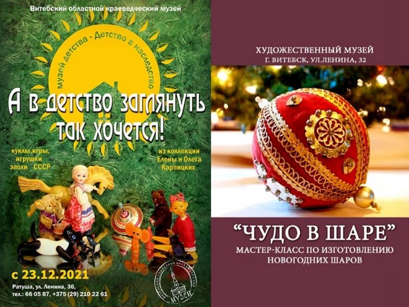 Выставочный проект коллекционеров Елены и Олега Карпицких «А в детство заглянуть так хочется» откликнется каждому. На выставке представлены игрушки, которые совсем недавно были частью нашего детства, были такими желанными для каждого советского ребенка. Взрослые смогут мысленно возвратиться в мир своего детства, поностальгировать, поделиться с детьми воспоминаниями, а юные гости попадут в зимнюю сказку. Выставку кукол дополняют детские книги издательства «Народная асвета», которые можно приобрести в дни работы выставки. На вернисаже состоится встреча с детским автором – Ириной Александровной Токаревой с проведением мастер-класса и раздачей автографов. Выставка будет работать до 23 января 2022 года.