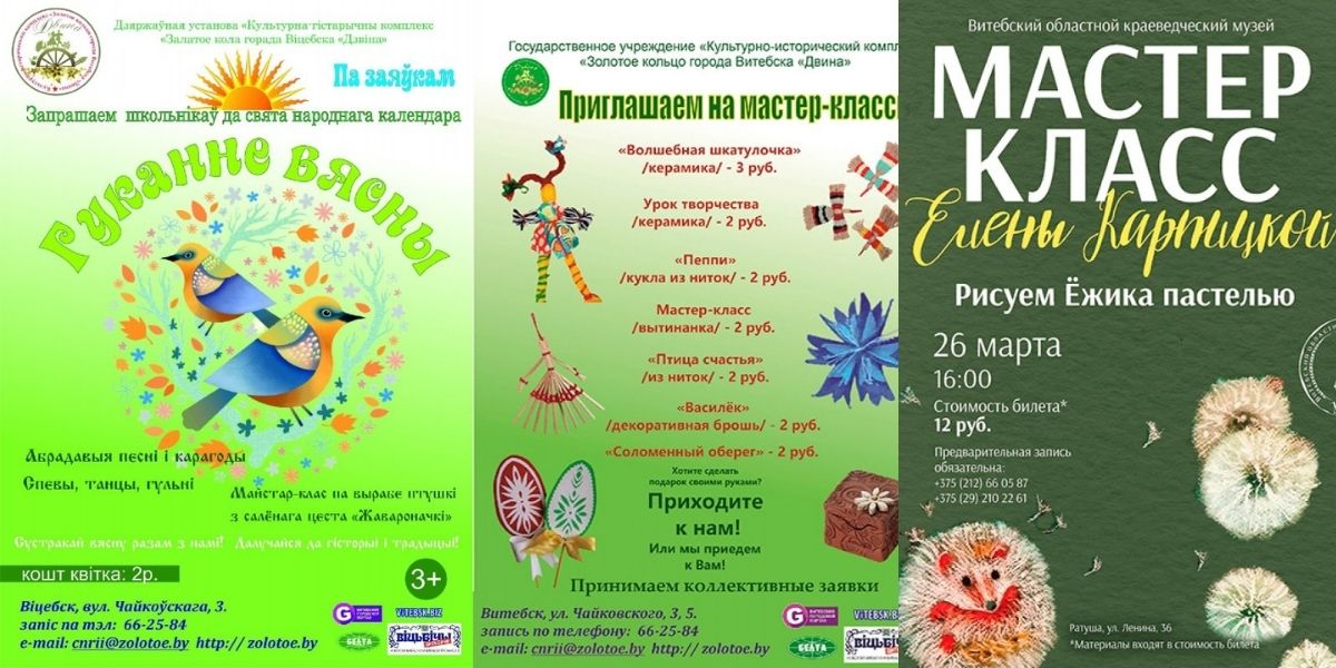 Начинаются школьные каникулы и их можно провести весело, отложив гаджеты. Школьники приглашаются на празднование «Гуканне вясны» в Культурно-историческом центре «Золотое кольцо». В программе танцы, песни, игры, а также мастер-класс по изготовление птиц из соленого теста. Так же для детей различных возрастов предлагаются на выбор мастер-классы. Принимают коллективные заявки.