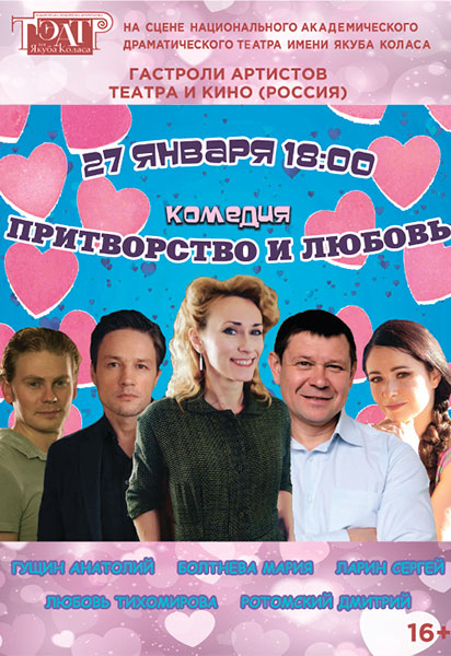 Национальный академический драматический театр имени Якуба Коласа покажет спектакль Вядзьмарка і Дыназаўрык для самых маленьких своих поклонников в субботу в 12.00, а взрослых зрителей сегодня в 19.00 ждут на Дзядзечкаў сон 16+, а в субботу в 18.00 - на Притворство и любовь 16+, который привезли российские актеры Анатолий Гущин, Мария Болтнева, Сергей Ларин, Любовь Тихомирова, Дмитрий Ротомский.