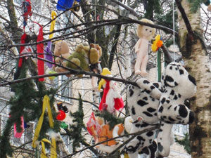 Прохожие также вспомнили, что на дереве вначале появились разноцветные ленточки, чуть позже плюшевый мишка, затем вторая игрушка, третья… Привязаны к ней и еловые лапки. На сегодняшний день на березе более 50 самых разнообразных «украшений». Почему же неизвестному приглянулась именно эта белостволая красавица? А, может, авторов несколько?