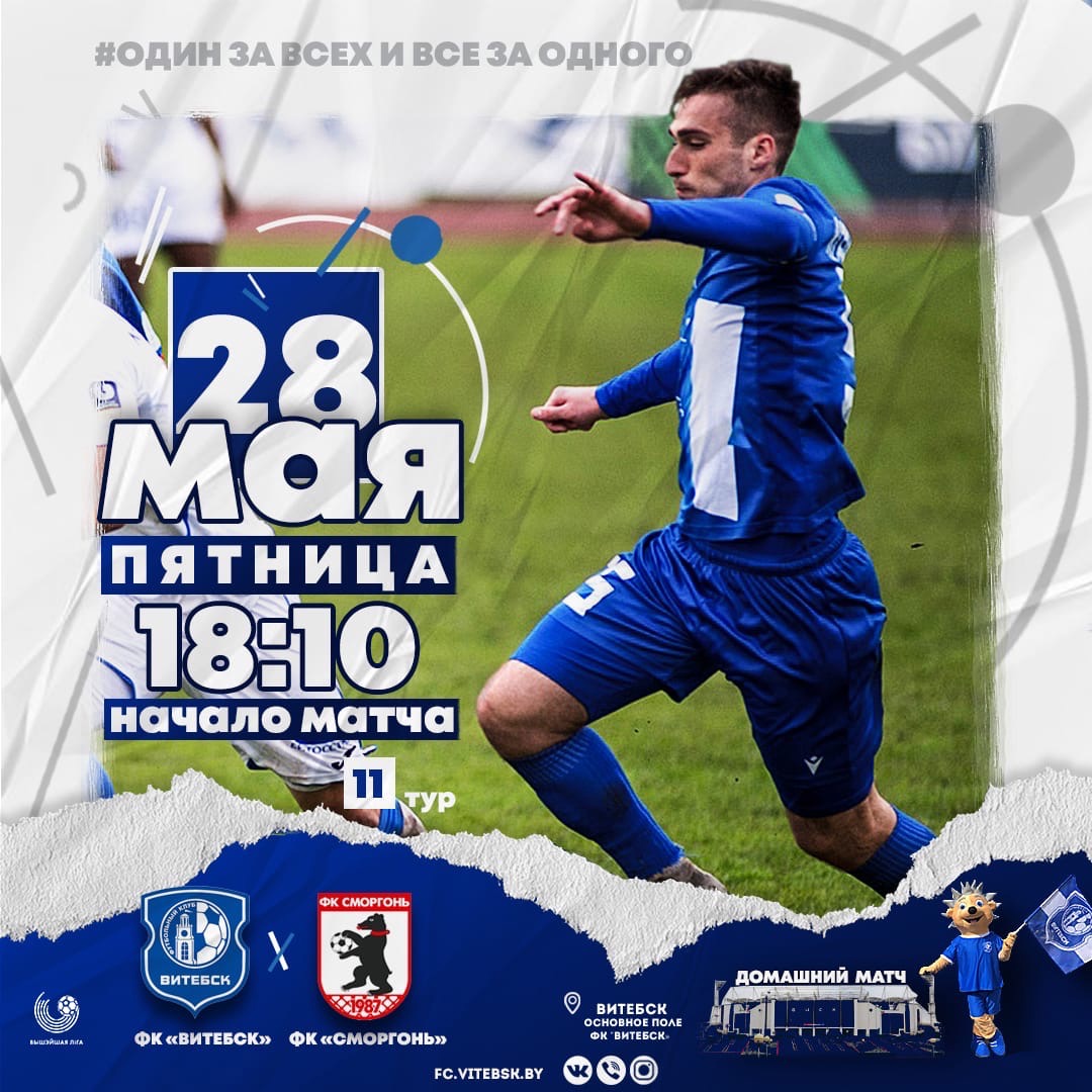 В пятницу, 28 мая, ФК «Витебска» примет на своем поле ФК «Сморгонь» в 11-м туре чемпионата Беларуси по футболу.