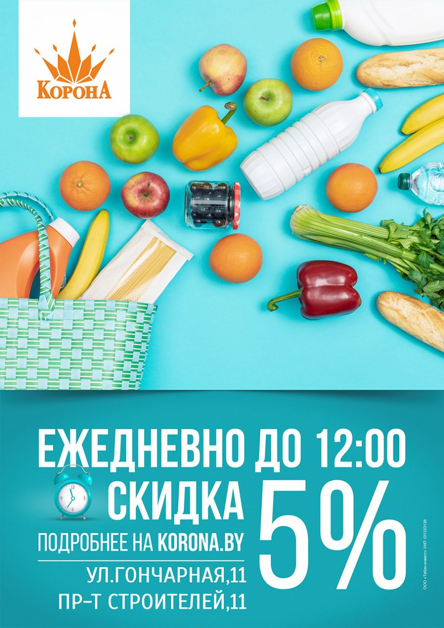 НАПОМИНАЕМ, что в мини-маркетах "Корона" ежедневно до 12 часов действует скидка 5% на всю сумму чека*.
