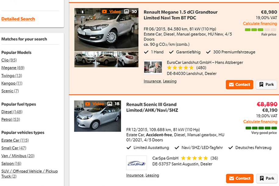 25 000 рублей, по нынешнему курсу НБ РБ это около 10 600 Евро, и за эти деньги mobie.de предлагает 201 подержанный Renault. Из них: 13 Twingo и 95 Clio, которые ни размерами салона, ни вместимостью багажника не блещут. Еще 11 – каблучки Kangoo, машины практичные, но не совсем легковые. В остатке еще 69 Megane и 7 Scenic, которые более других могут претендовать на статус семейного авто.