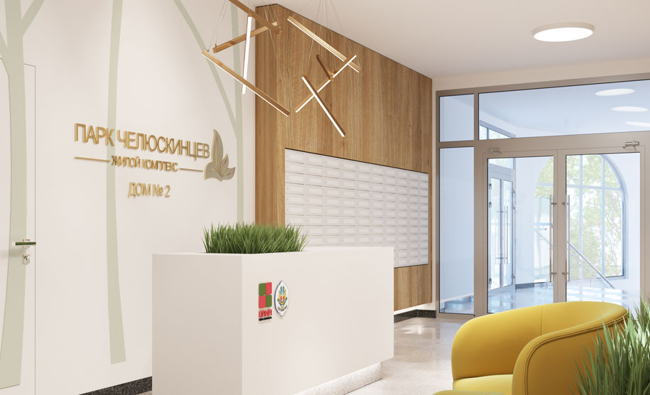 В просторном и светлом лобби, выполненном в эко-стиле, будут расположены стойка консьержа, зона встречи гостей и ожидания курьера, санитарная комната с пеленальным столиком для малыша, где можно привести ребенка в порядок после прогулки. А еще - место, чтобы помыть лапы домашним животным. Согласитесь осенью и зимой это особенно актуально!
