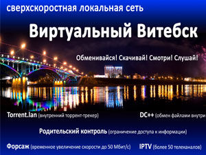 Услуга "Виртуальный Витебск" от компании "Гарант" дает Вам возможность обмениваться файлами напрямую между пользователями высокоскоростной локальной сети в масштабах города Витебска, смотреть более 50 цифровых IP-TV каналов.