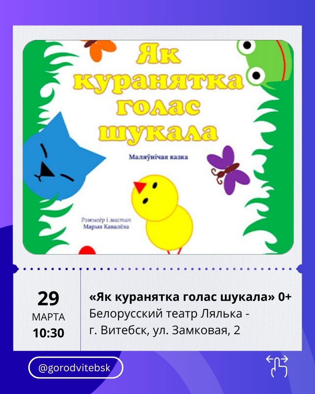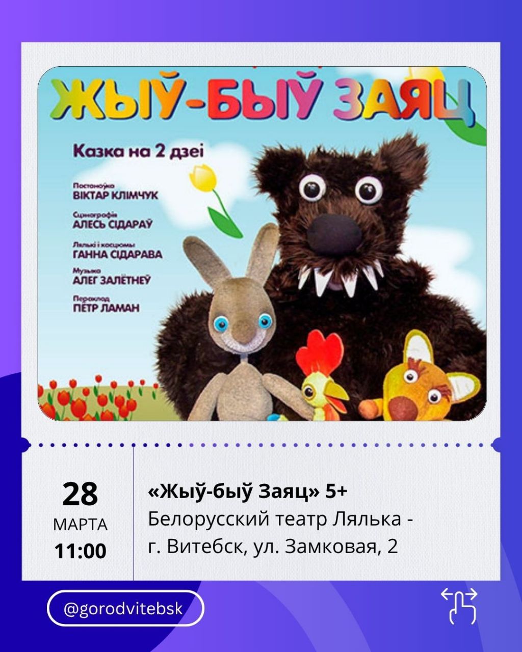 28 марта можно сходить на спектакль «Як Воўк мамай быў» (12:00) — знакомая история в новой интерпретации.