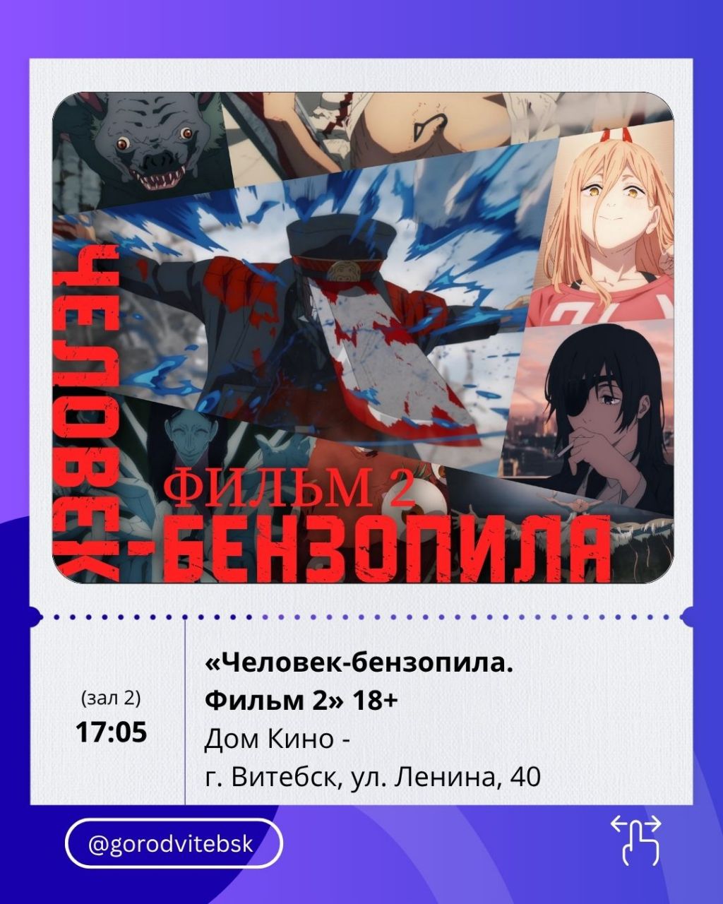 Поклонникам аниме подойдёт «Человек-бензопила. Фильм 2» (17:05) — динамичный, дерзкий и визуально яркий фильм.