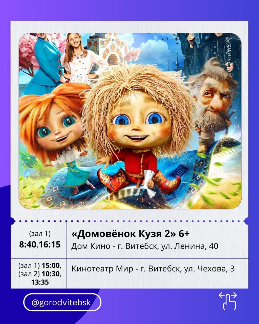 Для семейного просмотра — «Домовёнок Кузя 2» и «Доктор Гаф». Первый — лёгкое продолжение сказочной истории, второй — трогательное приключение девочки и ветеринара, который умеет понимать животных.