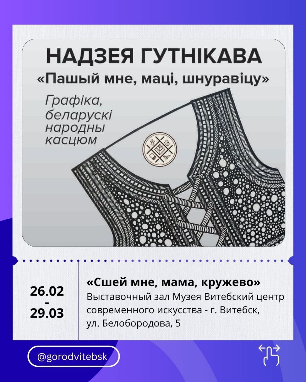 До 29 марта работает выставка «Сшей мне, мама, кружево» в Витебском центре современного искусства. Здесь представлены графические работы и традиционные белорусские костюмы — всего более 40 экспонатов, объединённых темой народной культуры и эстетики.