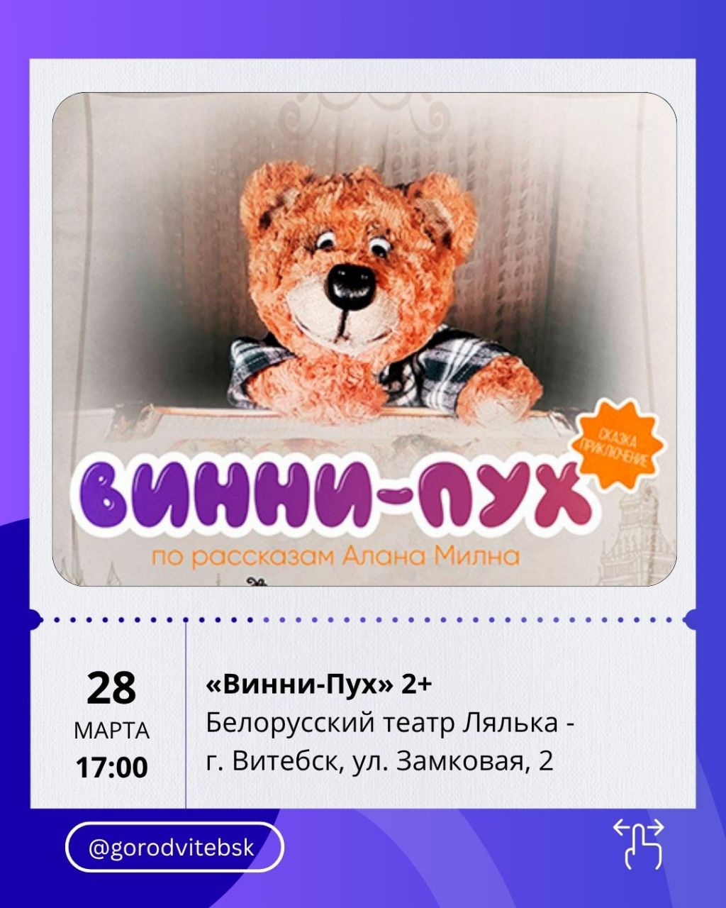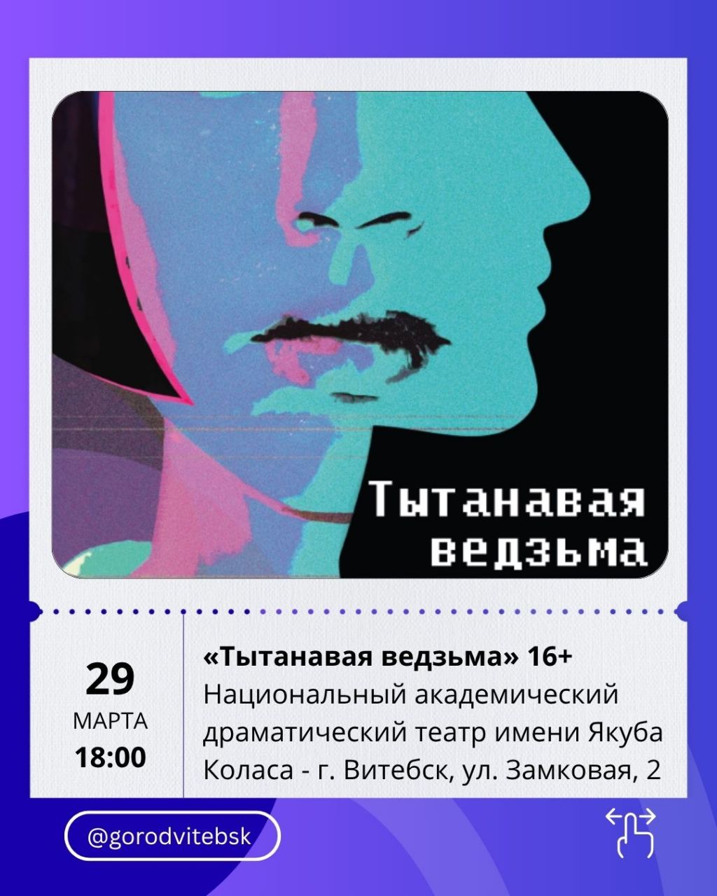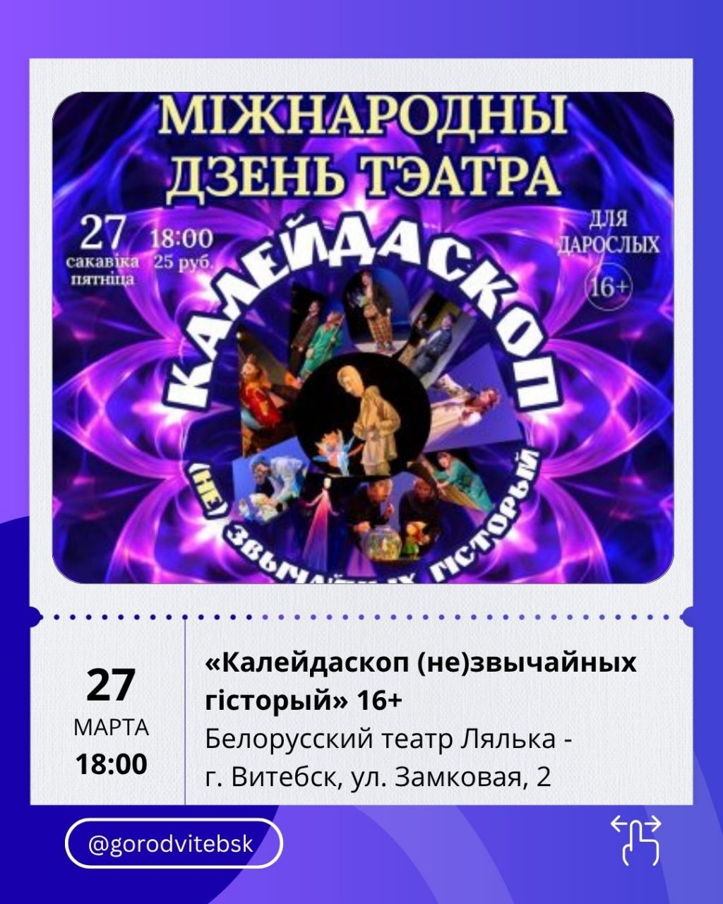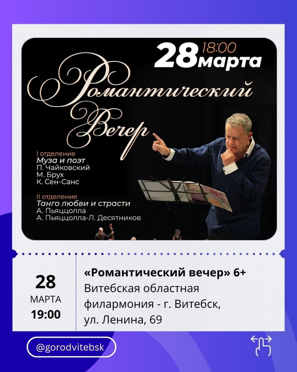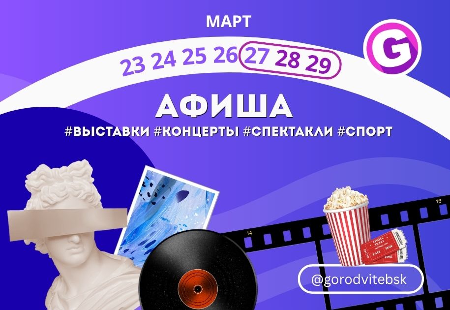 Последние мартовские выходные в Витебске — это отличный повод выбраться из дома и наполнить дни впечатлениями. Город предлагает насыщенную афишу: от премьер в театрах и атмосферных концертов до семейных спектаклей, киноновинок и ярких шоу. Рассказываем, куда стоит сходить с 27 по 29 марта.