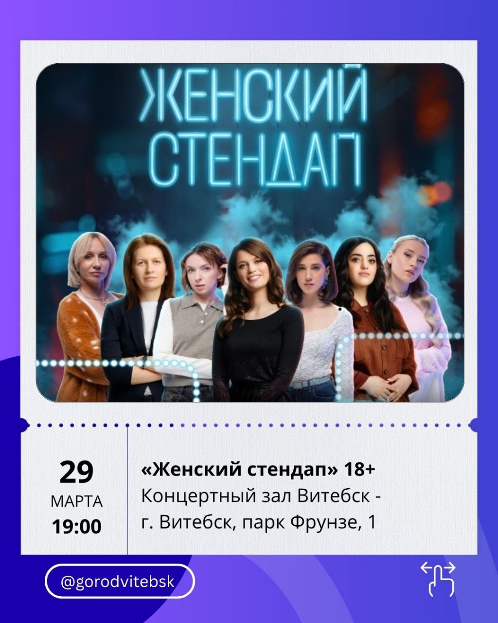 А 29 марта здесь же состоится «Женский стендап» (19:00) — откровенное и острое юмористическое шоу без табу.