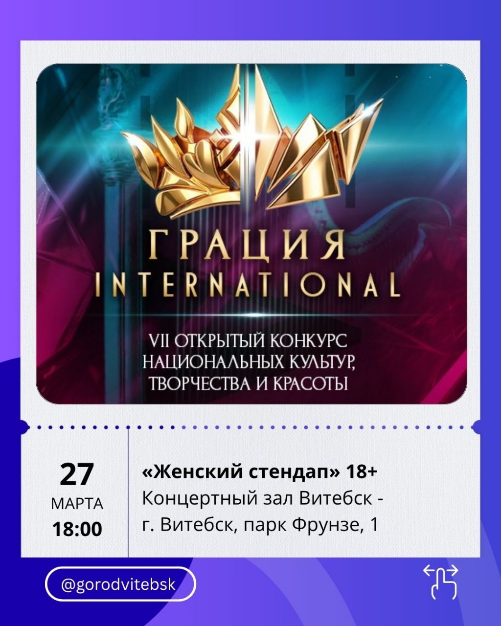 Одним из самых зрелищных событий станет финал конкурса «Грация International» (27 марта, 18:00, концертный зал «Витебск»). Это масштабное шоу с участниками из разных стран, национальными костюмами и творческими номерами.