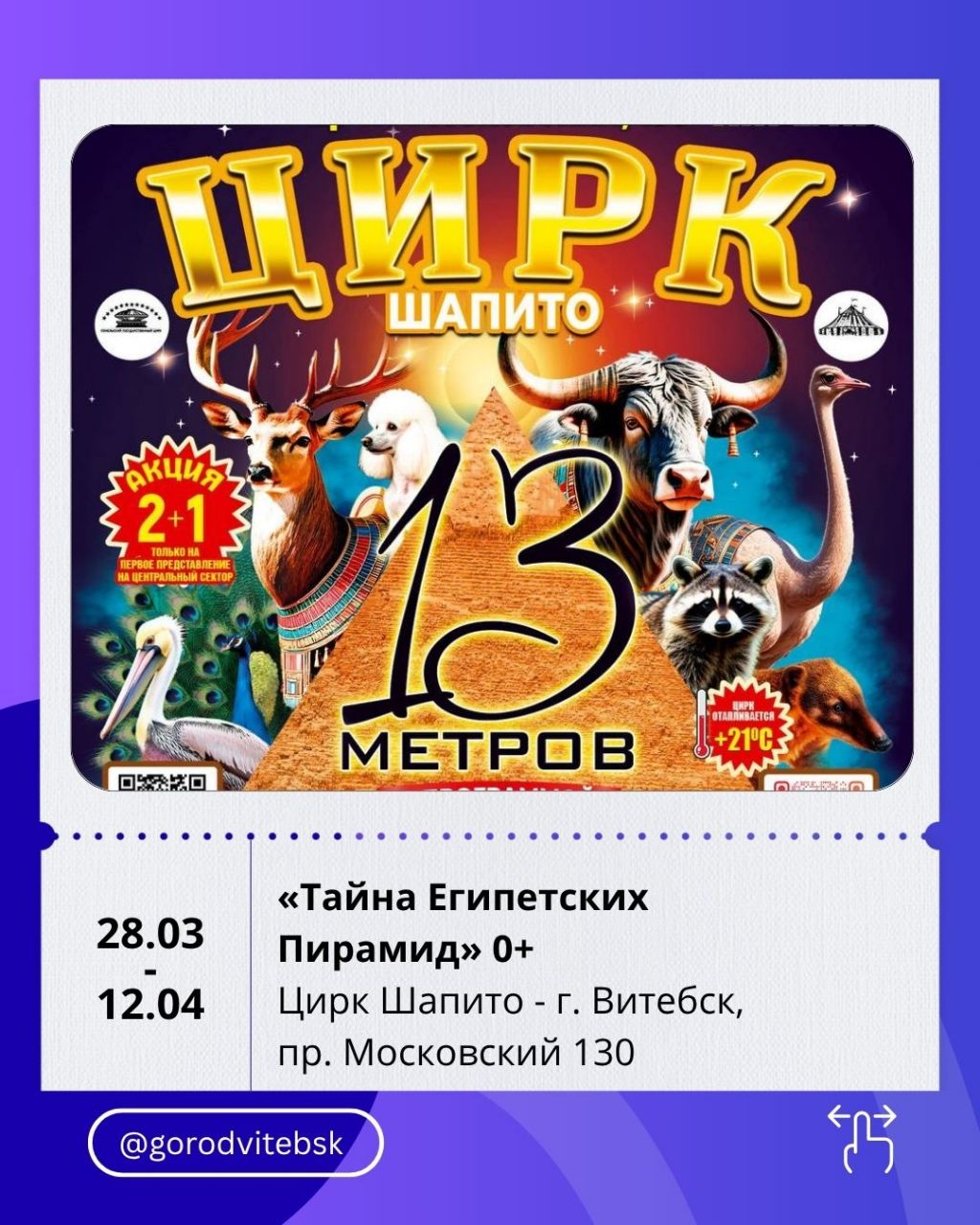 Любителям зрелищ стоит заглянуть и в цирк-шапито с программой «Тайна Египетских пирамид» (28–29 марта). Акробаты, дрессированные животные, шоу-балет и яркие декорации создают полноценное представление для всей семьи.