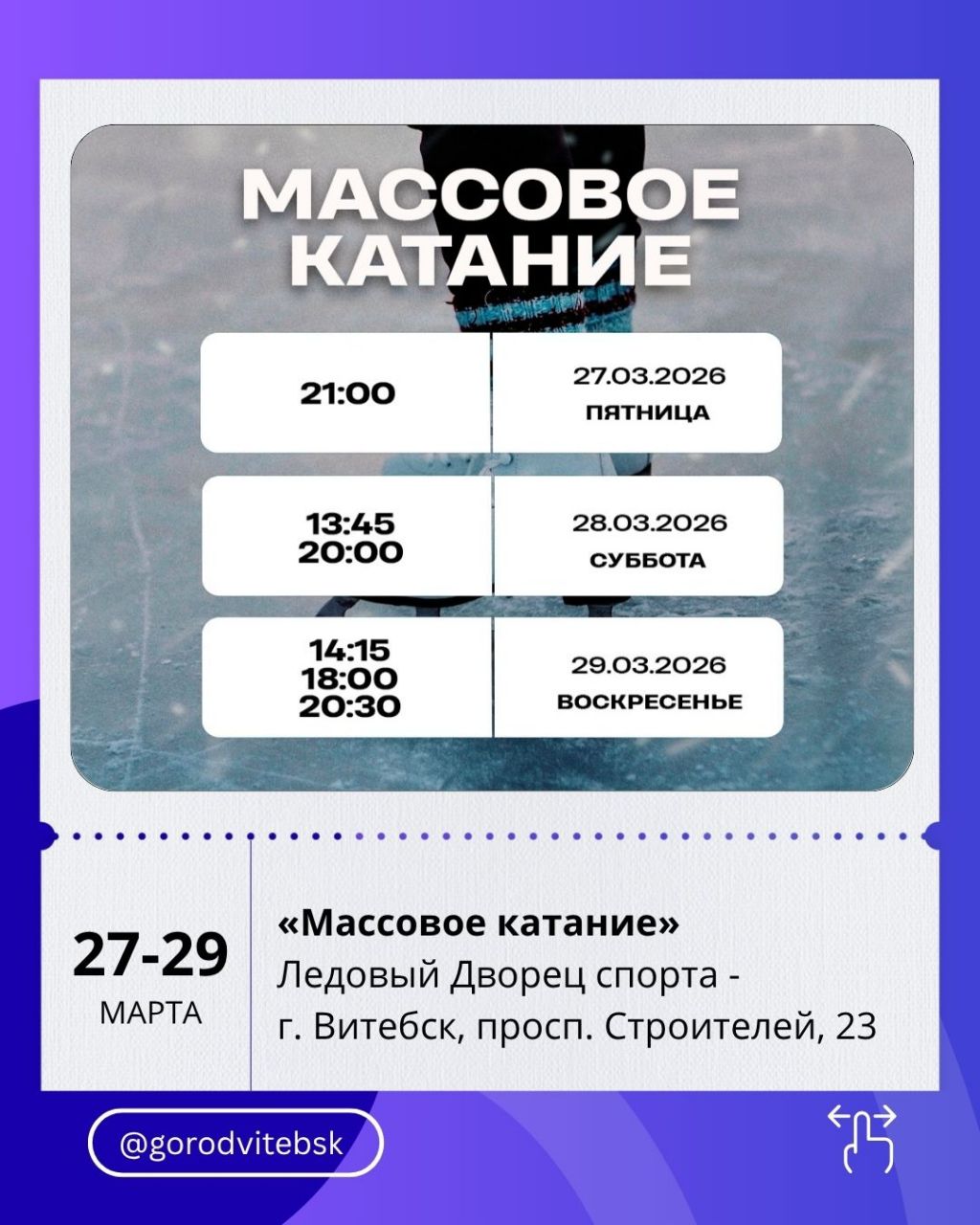 Для тех, кто предпочитает активные выходные, подойдёт массовое катание в Ледовом дворце (27–29 марта) — отличный вариант провести время с друзьями или семьёй.