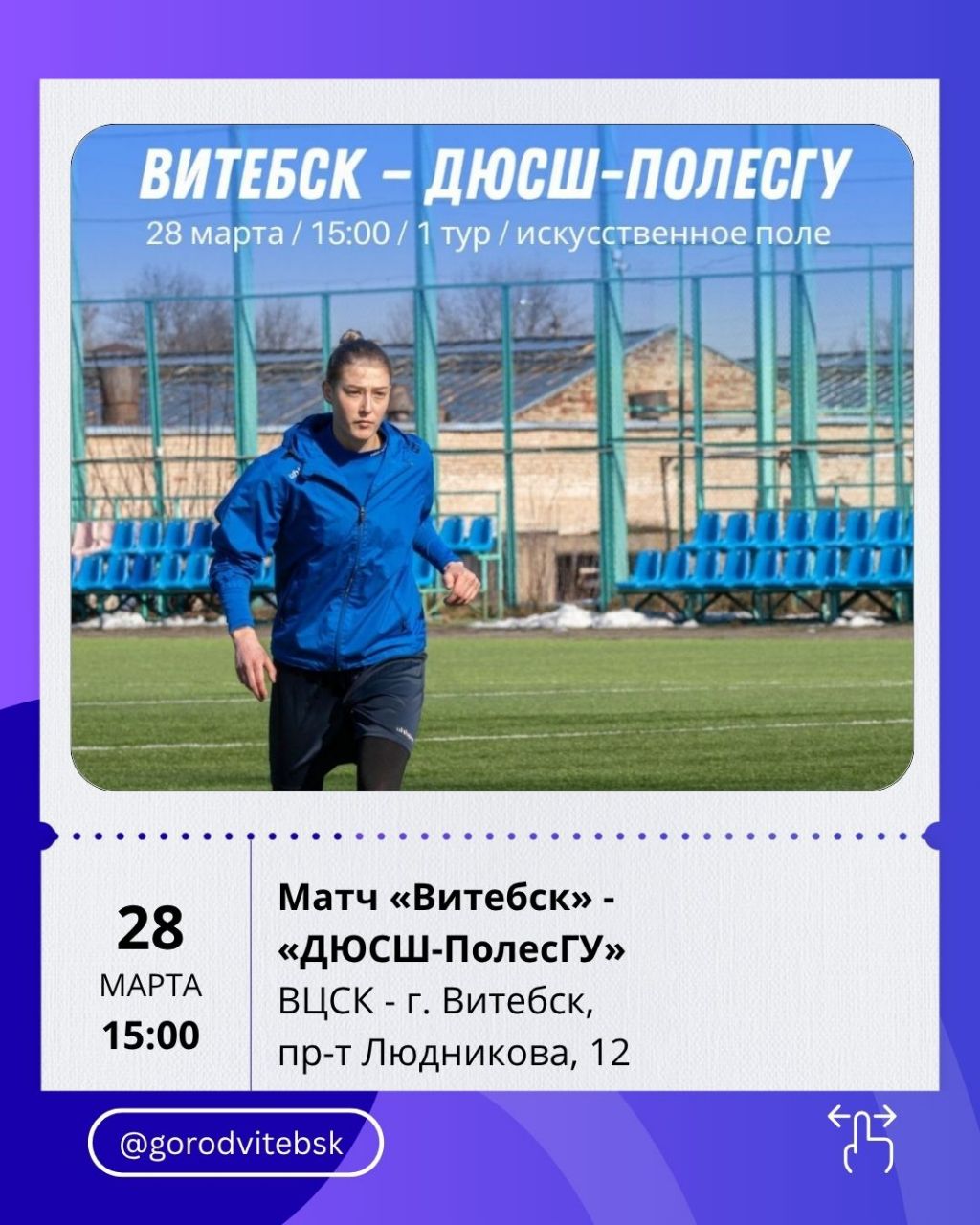 А 28 марта в 15:00 на поле ЦСК «Витебск» состоится футбольный матч женской лиги: «Витебск» сыграет против ДЮСШ-ПолесГУ.