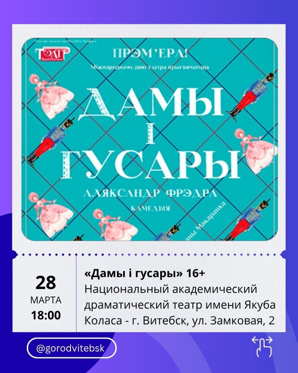 Тем, кто любит лёгкие комедии с интригой, подойдёт спектакль «Дамы і гусары» (28 марта, 18:00). История разворачивается вокруг неожиданных визитов, любовных хитросплетений и тонкого аристократического юмора.