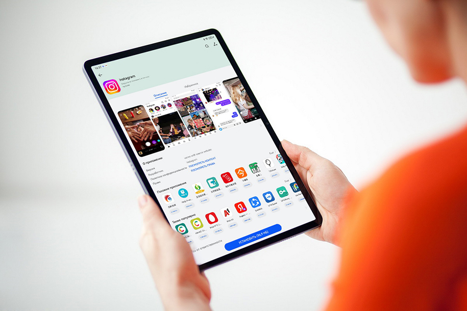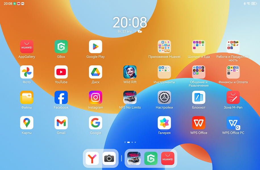 Мы вынесли на главный рабочий стол Huawei AppGallery, Google Play и GBox («ДжиБокс»), установили через магазин от Huawei несколько приложений Google, с помощью GBox – YouTube, Facebook и Instagram, а через Google Play – несколько игр. И все хорошо работает. Так что с этими утилитами планшет Huawei становится почти неотличим от любых других планшетов на Android.