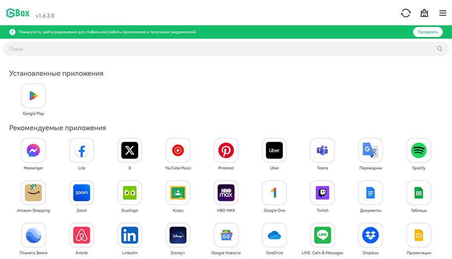- Дайте разрешение GBox («ДжиБокс») на доступ к мультимедиа и файлам для работы приложений и получения уведомлений через кнопку «Проверить».