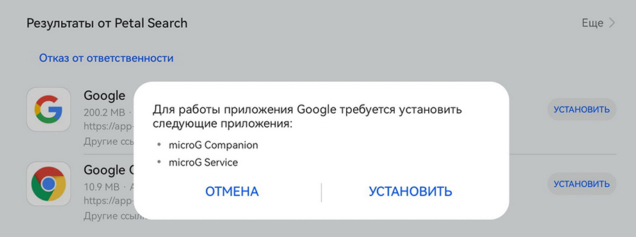 - Появится всплывающее окошко, которое предложит дополнительно загрузить два вспомогательных компонента microG («микроДжи»). Вот именно они как раз-таки и нужны. Нажмите «Установить».
